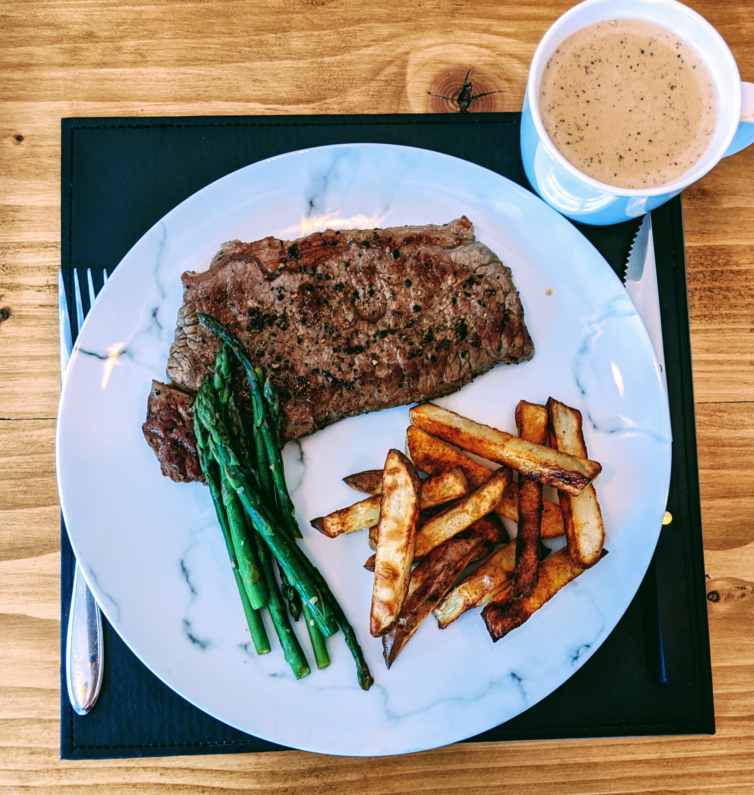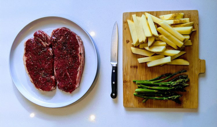 – Asparagus takes 3-4 minutes in the pan when the steaks are resting.